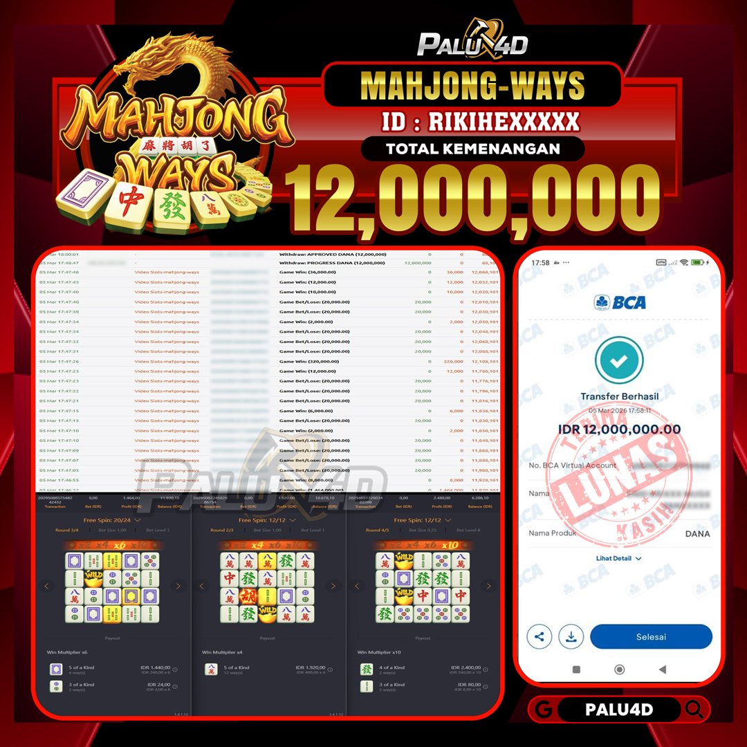 PALU4D – Selamat bagi pemenang yang mendapatkan jackpot hari ini 05 MARET 2026 di game Slot MAHJONG WINS  yang di sediakan situs palu4d dan sudah kami bayar lunas. Berikut data pemenang hari ini yang kami proses dengan cepat ke rekening tujuan yang terdaftar di akun selama ±10 menit.
