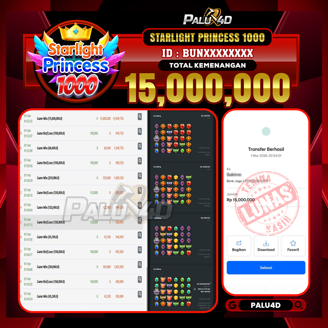 - BONUS TURN OVER BULANANPALU4D – Menang Slot STARLIGHT PRINCESS 1000 Rp.15.000.000.,- LUNAS