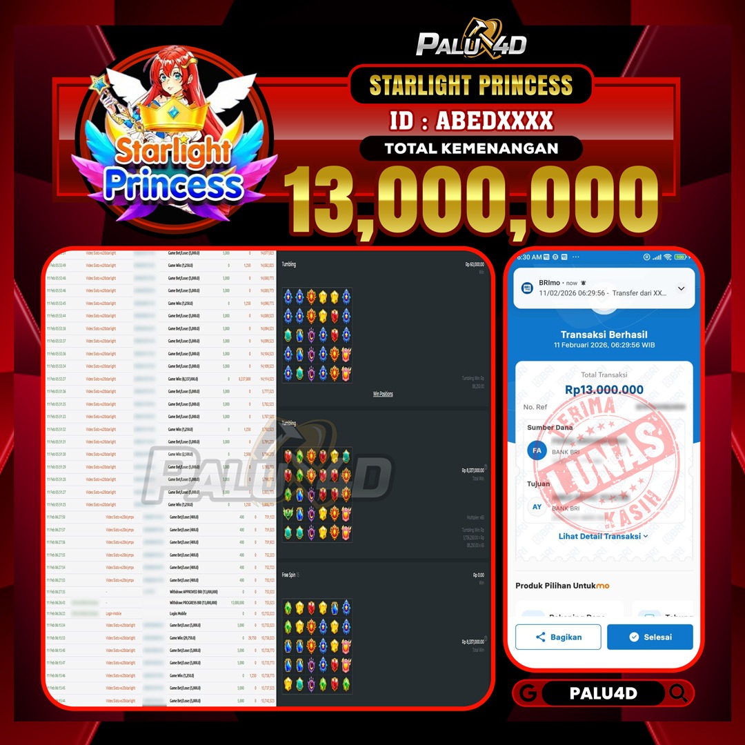 PALU4D – Selamat bagi pemenang yang mendapatkan jackpot hari ini 11 February 2026 di game Slot STARLIGHT PRINCESS yang di sediakan situs palu4d dan sudah kami bayar lunas. Berikut data pemenang hari ini yang kami proses dengan cepat ke rekening tujuan yang terdaftar di akun selama ±10 menit.