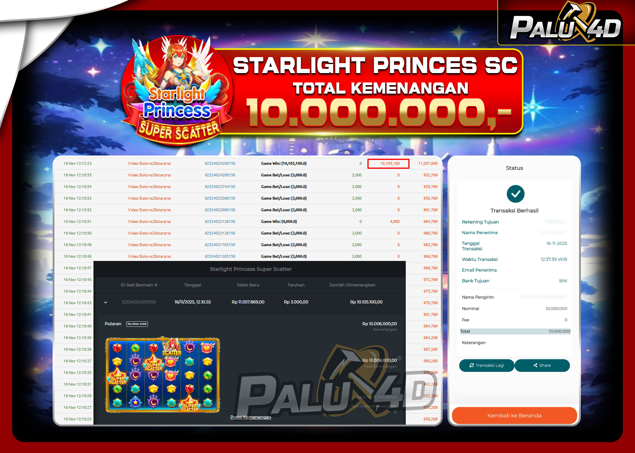 PALU4D – Selamat bagi pemenang yang mendapatkan jackpot hari ini 16 NOVEMBER 2025 di game Slot STARLIGHT PRINCESS SUPER SCATTER yang di sediakan situs palu4d dan sudah kami bayar lunas. Berikut data pemenang hari ini yang kami proses dengan cepat ke rekening tujuan yang terdaftar di akun selama ±10 menit.