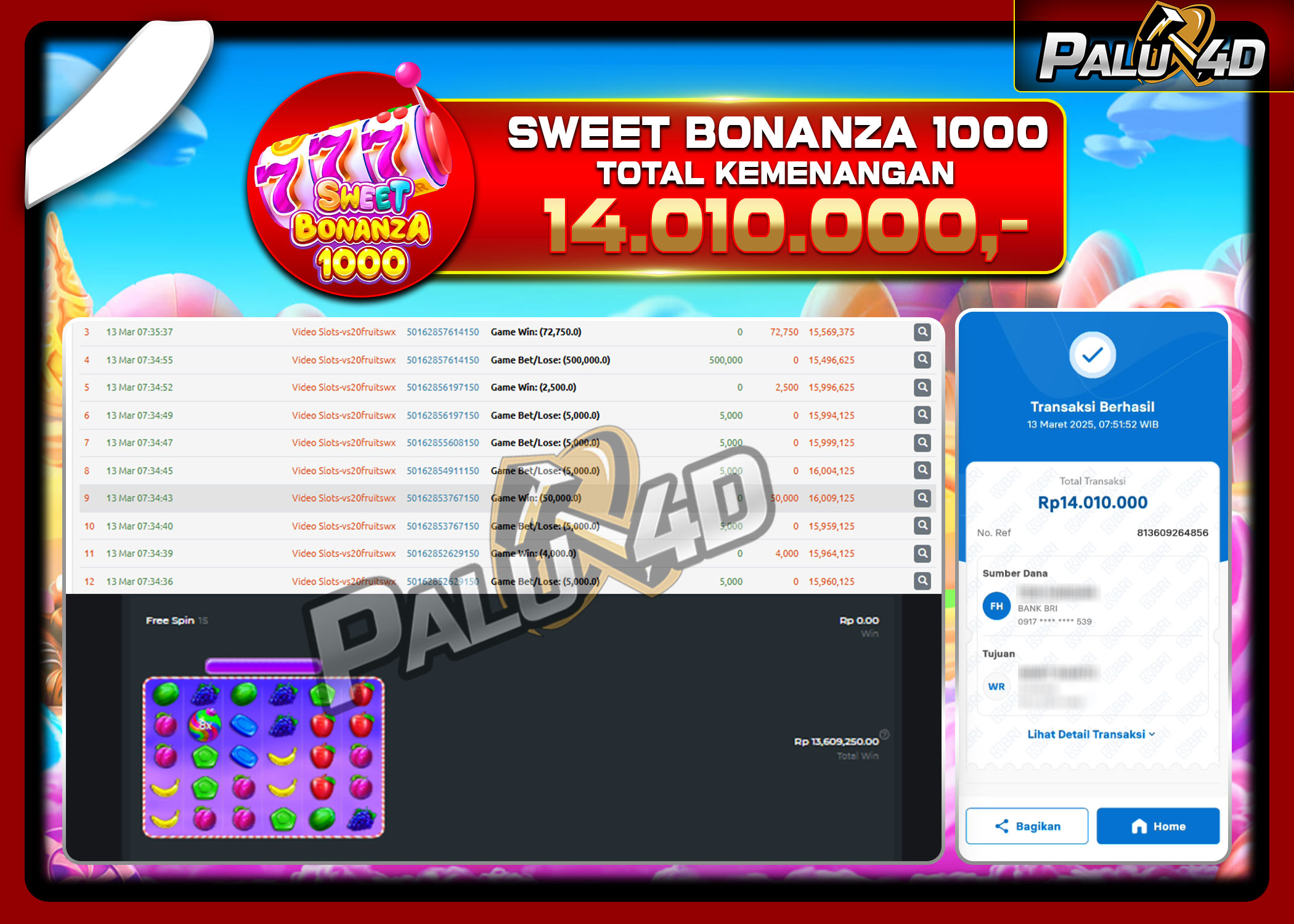 PALU4D – Selamat bagi pemenang yang mendapatkan jackpot hari ini 13 Maret 2025 di game Slot SWEET BONANZA 1000  yang di sediakan situs palu4d dan sudah kami bayar lunas. Berikut data pemenang hari ini yang kami proses dengan cepat ke rekening tujuan yang terdaftar di akun selama ±10 menit.