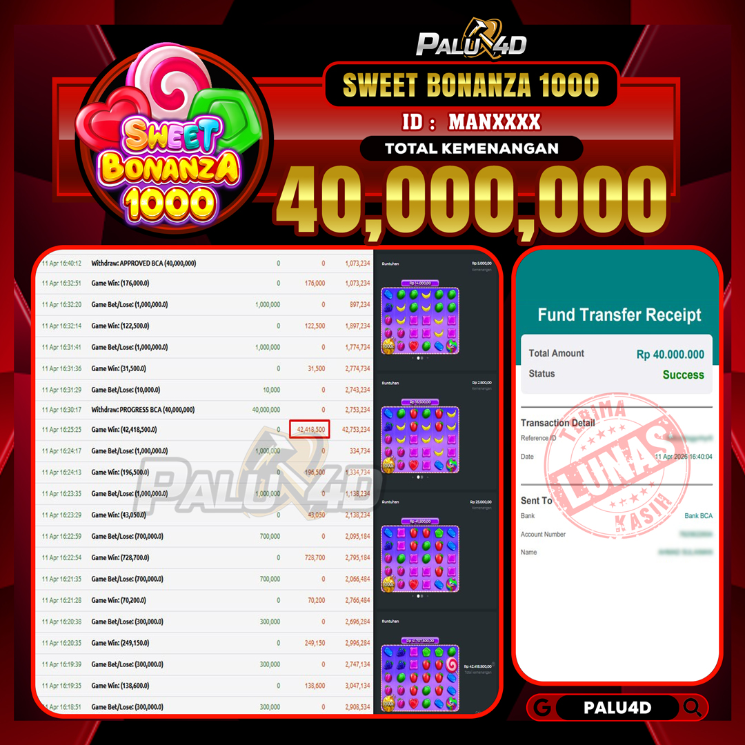 PALU4D – Selamat bagi pemenang yang mendapatkan jackpot hari ini 11 APRIL 2026 di game Slot SWEET BONANZA 1000  yang di sediakan situs palu4d dan sudah kami bayar lunas. Berikut data pemenang hari ini yang kami proses dengan cepat ke rekening tujuan yang terdaftar di akun selama ±10 menit.