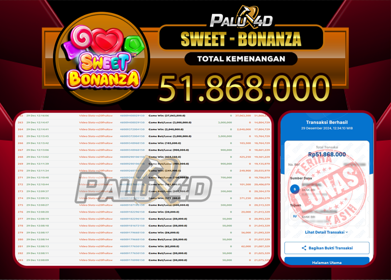 PALU4D – Menang Slot SWEET BONANZA Rp.51.868.000.,- LUNAS