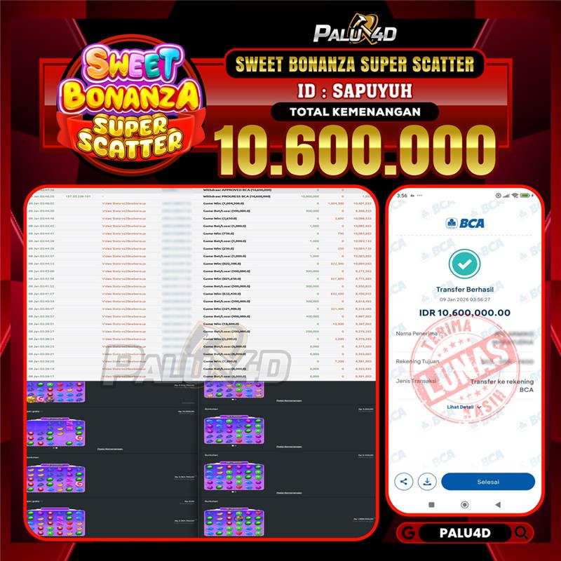 PALU4D – Selamat bagi pemenang yang mendapatkan jackpot hari ini 09 JANUARI 2026 di game Slot SWEET BONANZA SUPER SCATTER yang di sediakan situs palu4d dan sudah kami bayar lunas. Berikut data pemenang hari ini yang kami proses dengan cepat ke rekening tujuan yang terdaftar di akun selama ±10 menit.