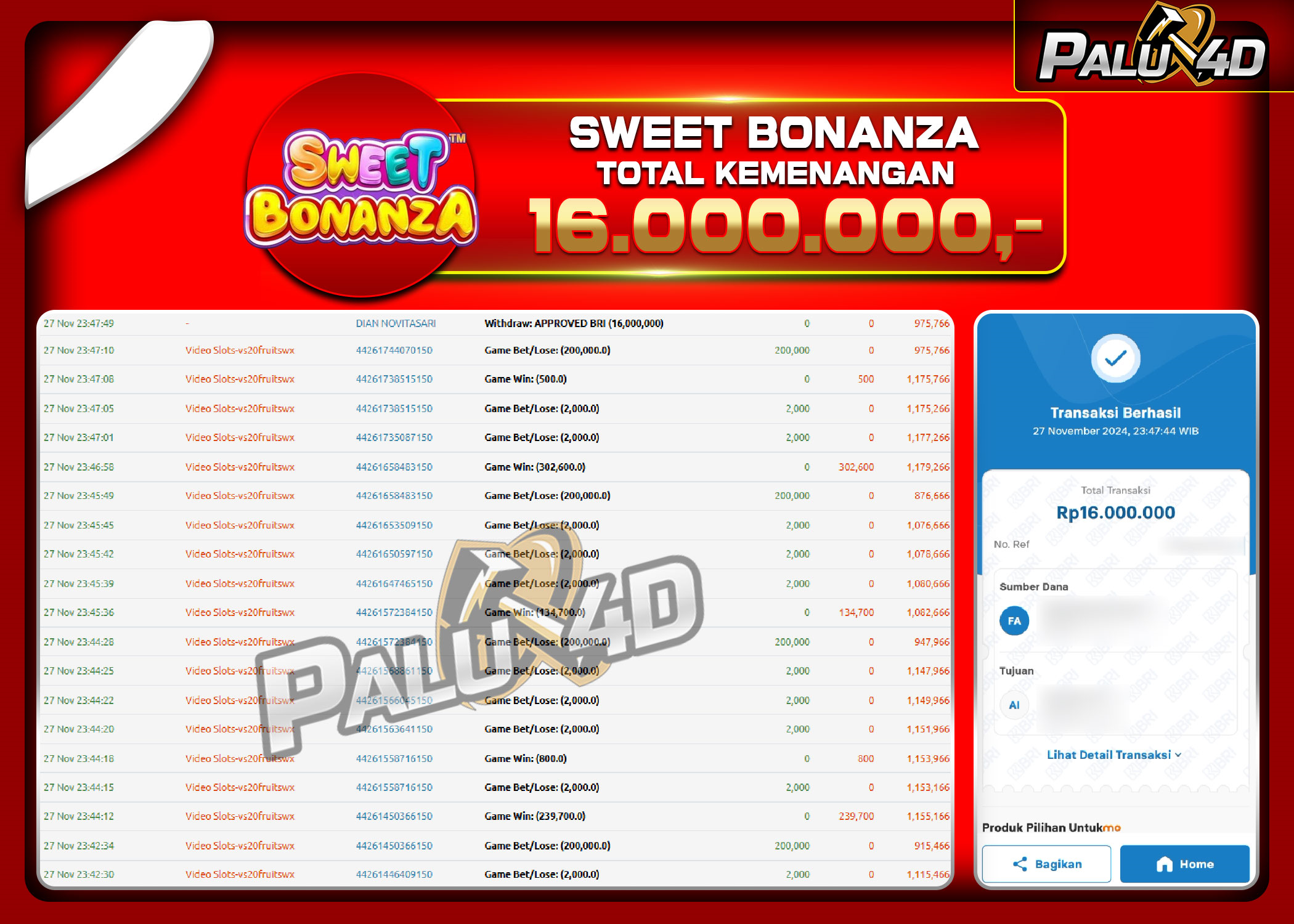 PALU4D – Selamat bagi pemenang yang mendapatkan jackpot hari ini 27 November 2024 di game Slot SWEET BONANZA yang di sediakan situs palu4d dan sudah kami bayar lunas. Berikut data pemenang hari ini yang kami proses dengan cepat ke rekening tujuan yang terdaftar di akun selama ±10 menit.