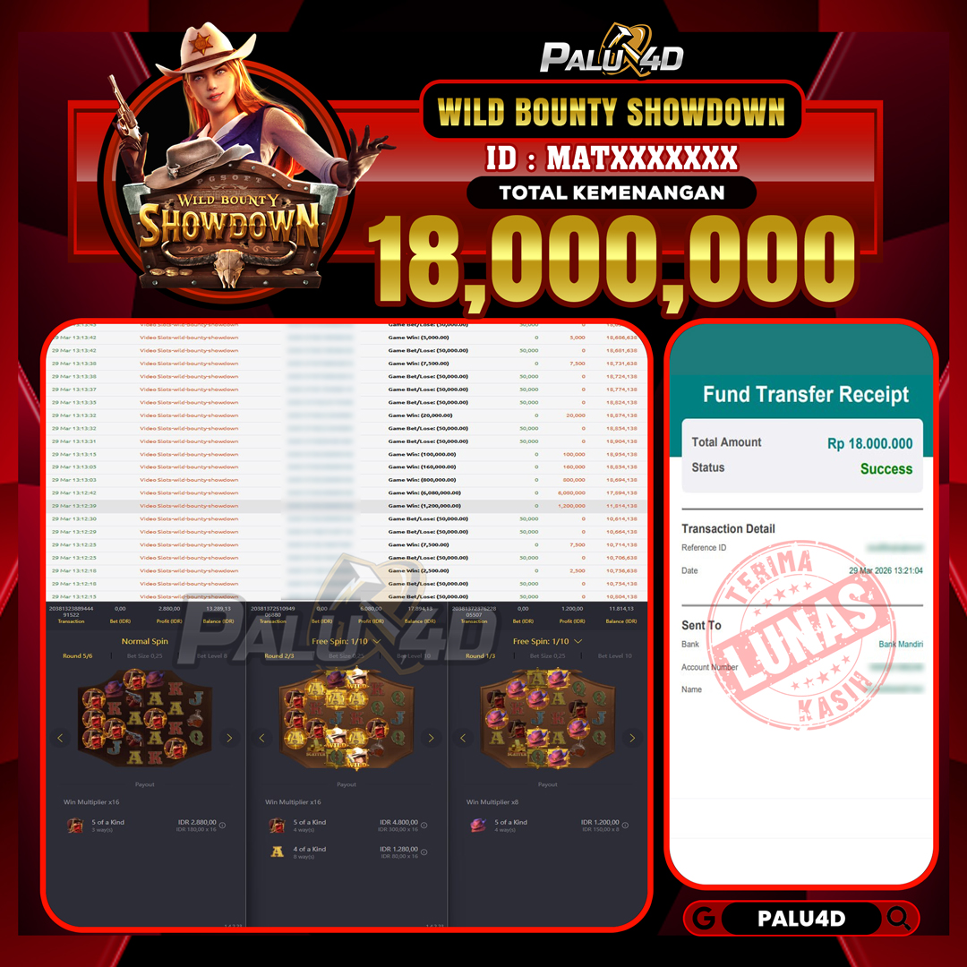 PALU4D – Selamat bagi pemenang yang mendapatkan jackpot hari ini 29 MARET 2026 di game Slot WILD BOUNTY SHOWDOWN   yang di sediakan situs palu4d dan sudah kami bayar lunas. Berikut data pemenang hari ini yang kami proses dengan cepat ke rekening tujuan yang terdaftar di akun selama ±10 menit.