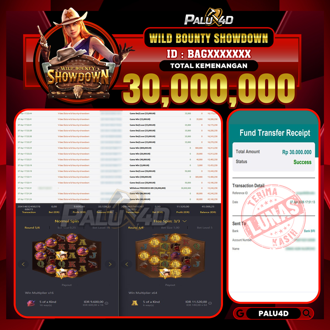 PALU4D – Selamat bagi pemenang yang mendapatkan jackpot hari ini 07 APRIL 2026 di game Slot WILD BOUNTY SHOWDOWN yang di sediakan situs palu4d dan sudah kami bayar lunas. Berikut data pemenang hari ini yang kami proses dengan cepat ke rekening tujuan yang terdaftar di akun selama ±10 menit.