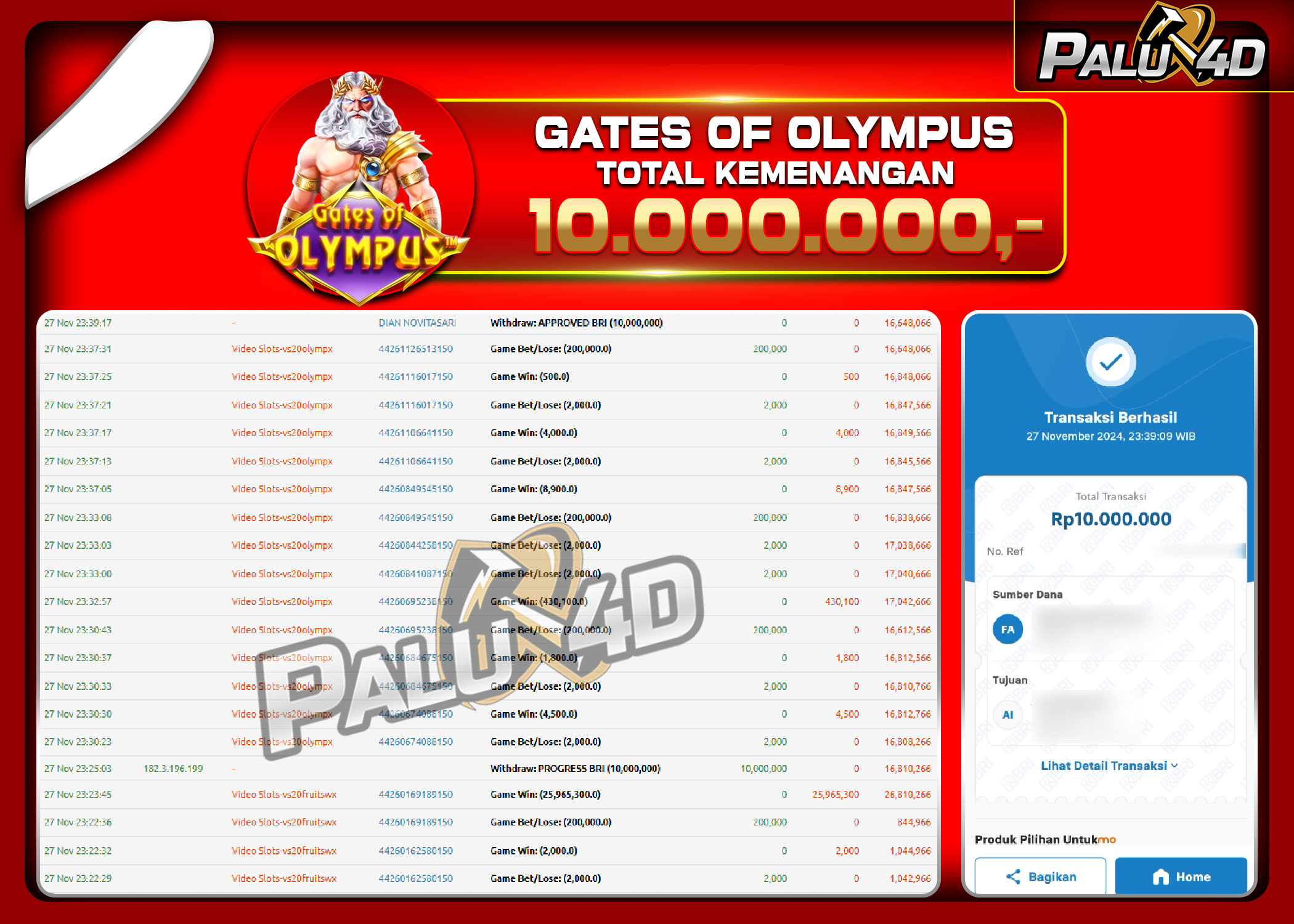 PALU4D – Selamat bagi pemenang yang mendapatkan jackpot hari ini 27 November 2024 di game Slot GATES OF OLYMPUS yang di sediakan situs palu4d dan sudah kami bayar lunas. Berikut data pemenang hari ini yang kami proses dengan cepat ke rekening tujuan yang terdaftar di akun selama ±10 menit.