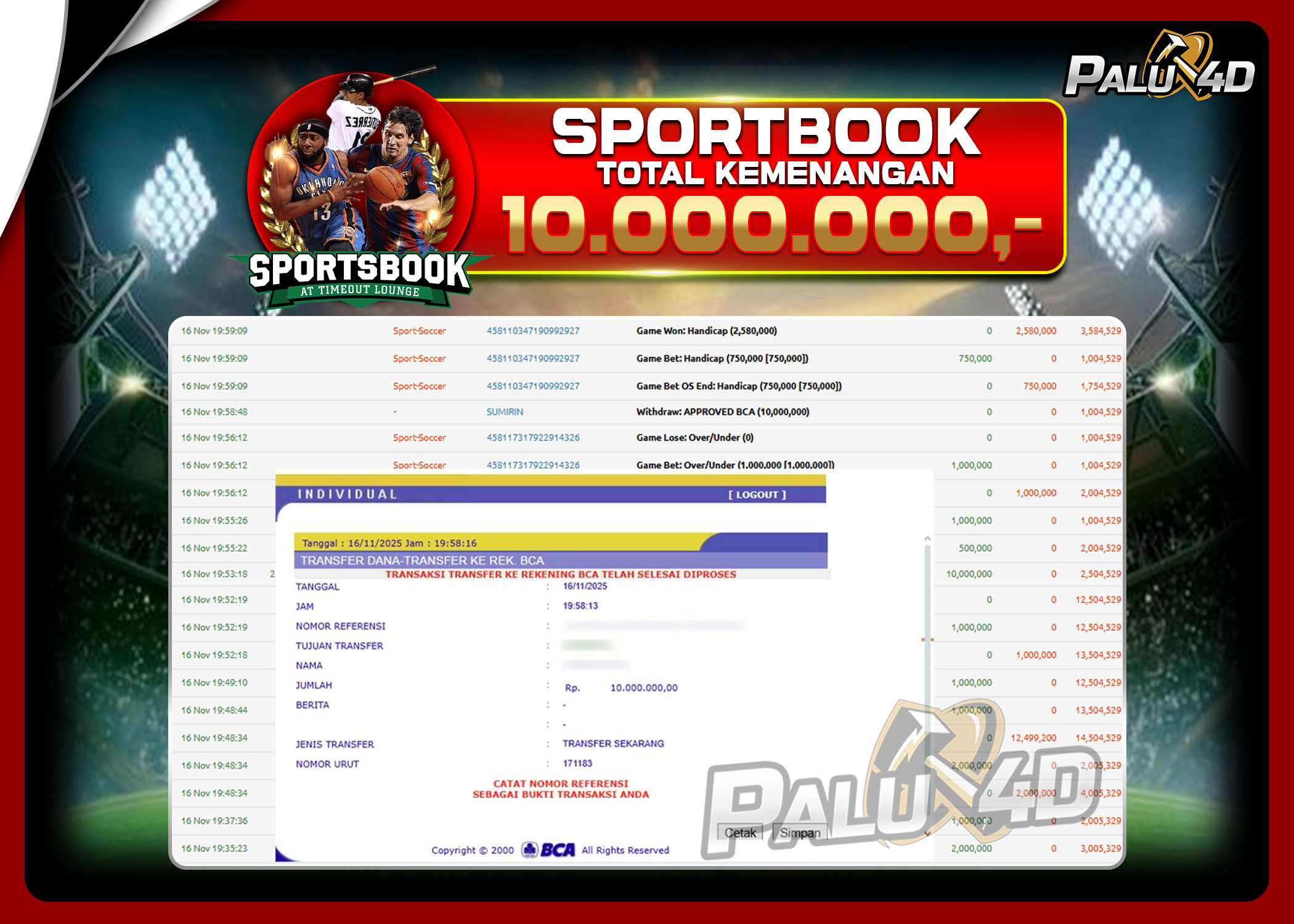 PALU4D – Selamat bagi pemenang yang mendapatkan jackpot hari ini 16 NOVEMBER 2025 di game Sportbook TARUHAN BOLA yang di sediakan situs palu4d dan sudah kami bayar lunas. Berikut data pemenang hari ini yang kami proses dengan cepat ke rekening tujuan yang terdaftar di akun selama ±10 menit.