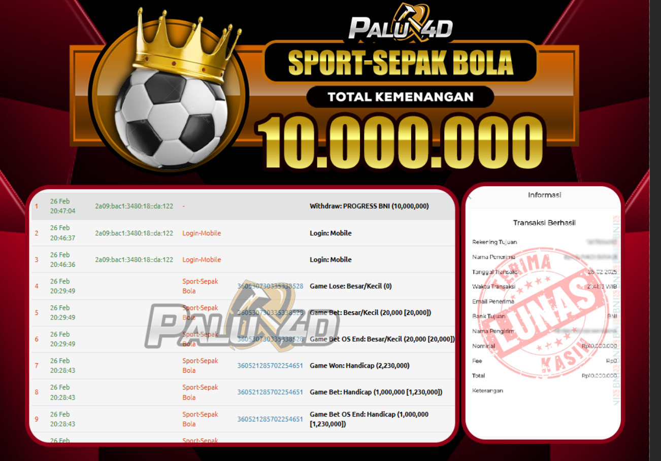 PALU4D – Menang SPORTBOOKS TARUHAN BOLA Rp.10.000.000.,- LUNAS