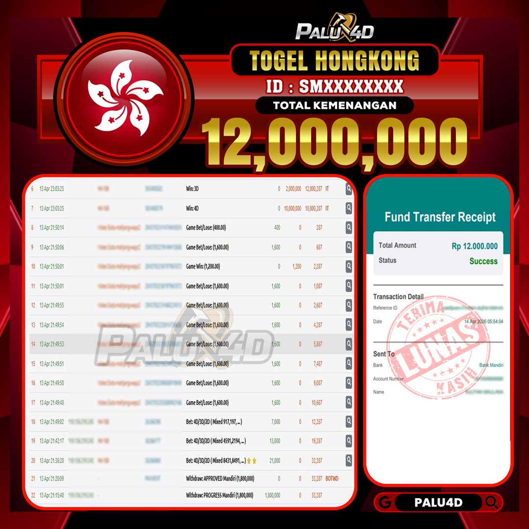 PALU4D – Selamat bagi pemenang yang mendapatkan jackpot hari ini 14 APRIL2026 di game Togel HONGKONG yang di sediakan situs palu4d dan sudah kami bayar lunas. Berikut data pemenang hari ini yang kami proses dengan cepat ke rekening tujuan yang terdaftar di akun selama ±10 menit.