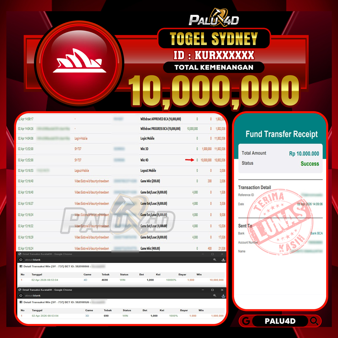 PALU4D – Selamat bagi pemenang yang mendapatkan jackpot hari ini 02 APRIL 2026 di game Togel SYDNEY POOL yang di sediakan situs palu4d dan sudah kami bayar lunas. Berikut data pemenang hari ini yang kami proses dengan cepat ke rekening tujuan yang terdaftar di akun selama ±10 menit.