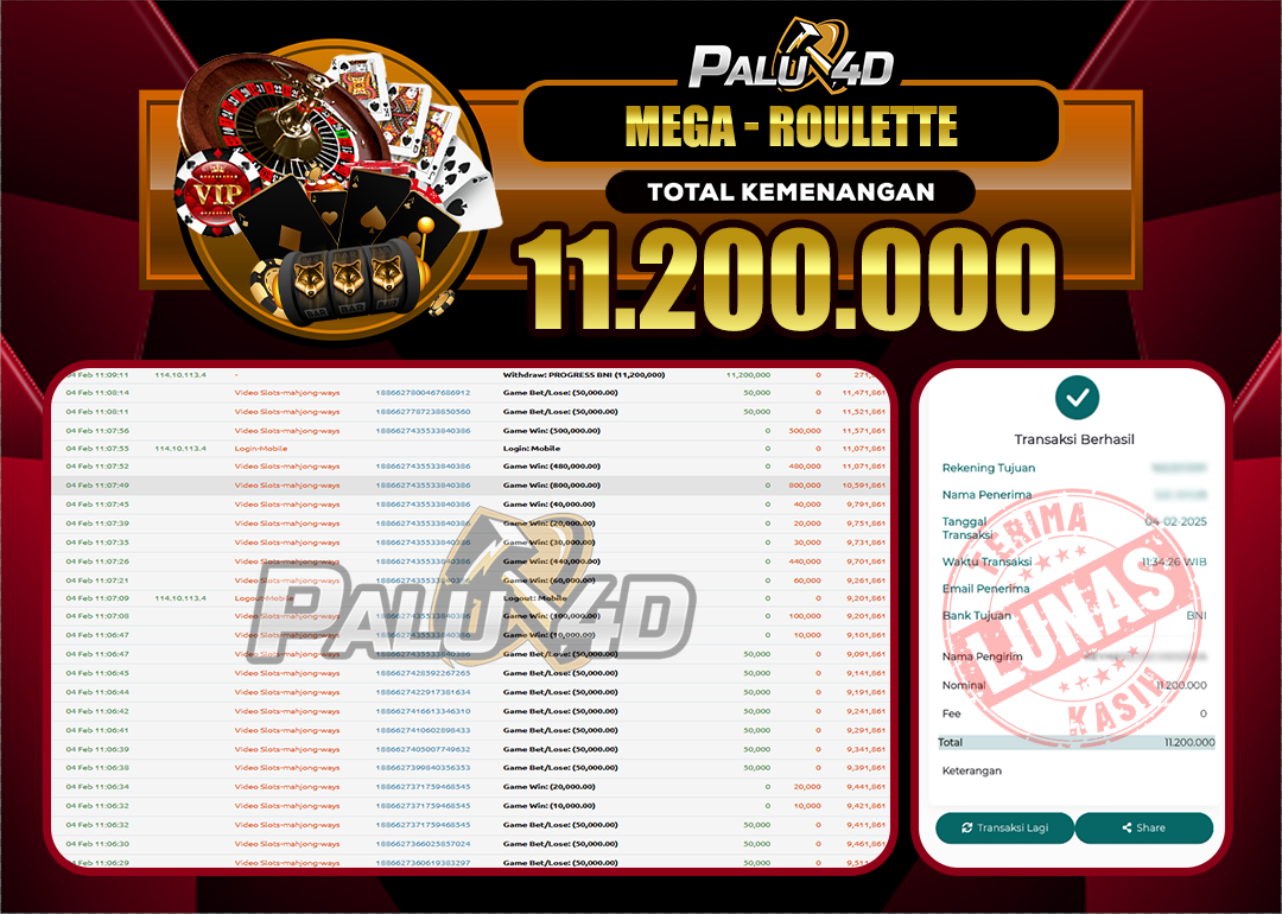 PALU4D – Selamat bagi pemenang yang mendapatkan jackpot hari ini 04 February 2025 di game Slot MEGA ROULETTE yang di sediakan situs palu4d dan sudah kami bayar lunas. Berikut data pemenang hari ini yang kami proses dengan cepat ke rekening tujuan yang terdaftar di akun selama ±10 menit.