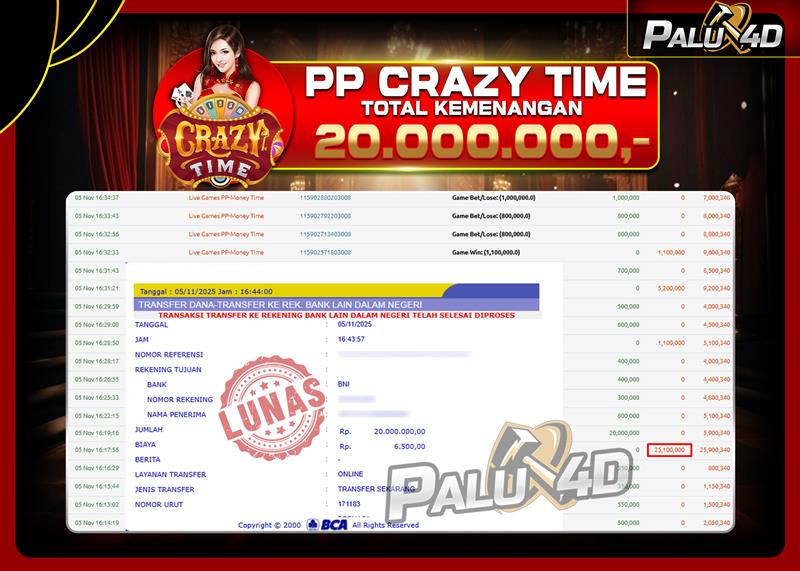 06/11/202506/11/2025LIVE CASINO PALU4D – Menang Live Games CRAZY TIME Rp 20.000.000.,- LUNAS PALU4D – Menang Live Games CRAZY TIME Rp 20.000.000.,- LUNAS PALU4D – Selamat bagi pemenang yang mendapatkan jackpot hari ini 05 NOVEMBER […]