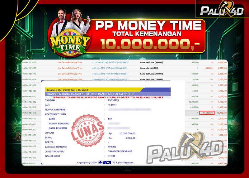 06/11/202506/11/2025LIVE CASINO PALU4D – Menang Live Games MONEY TIME Rp 10.000.000.,- LUNAS PALU4D – Menang Live Games MONEY TIME Rp 10.000.000.,- LUNAS PALU4D – Selamat bagi pemenang yang mendapatkan jackpot hari ini 05 NOVEMBER […]