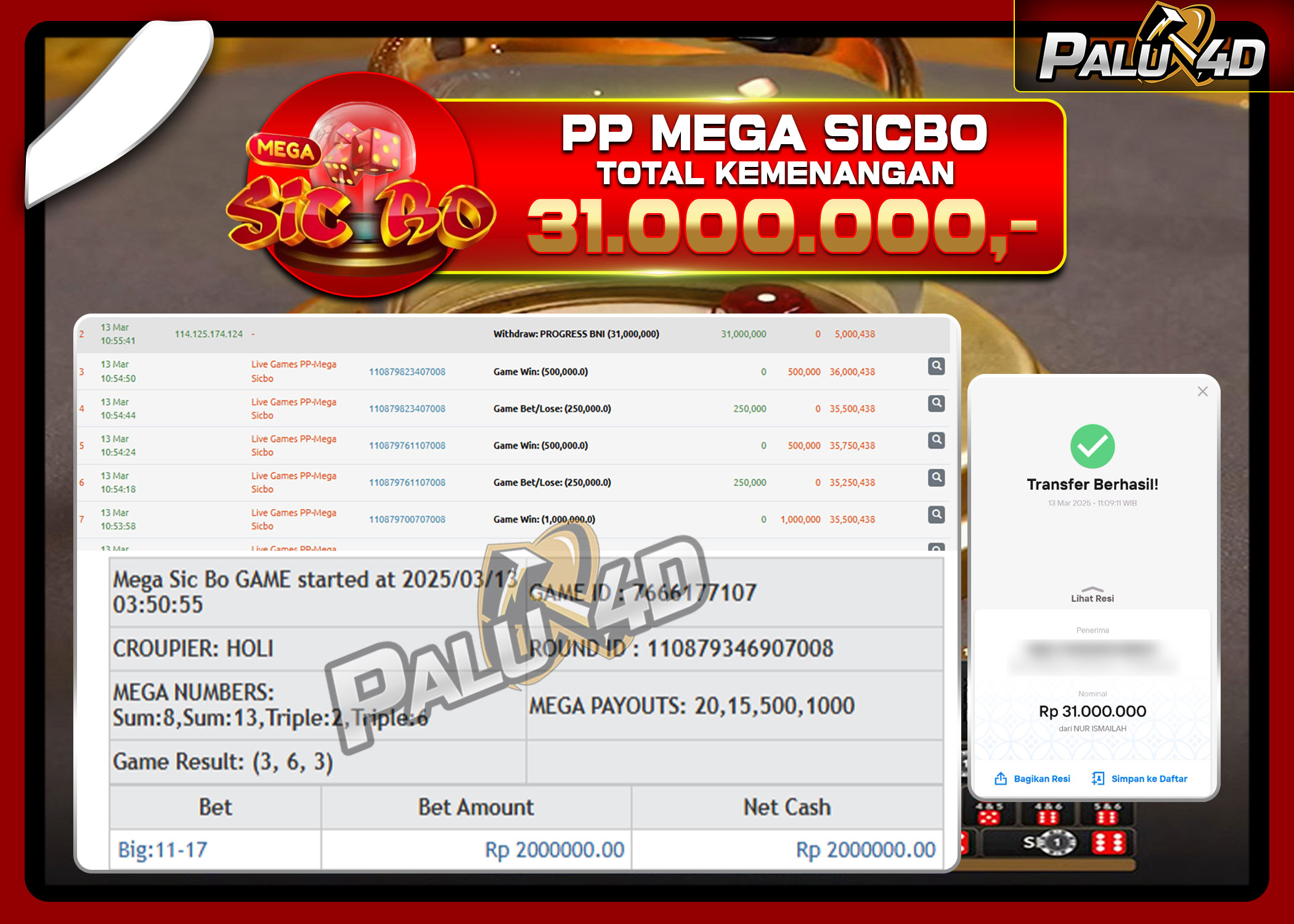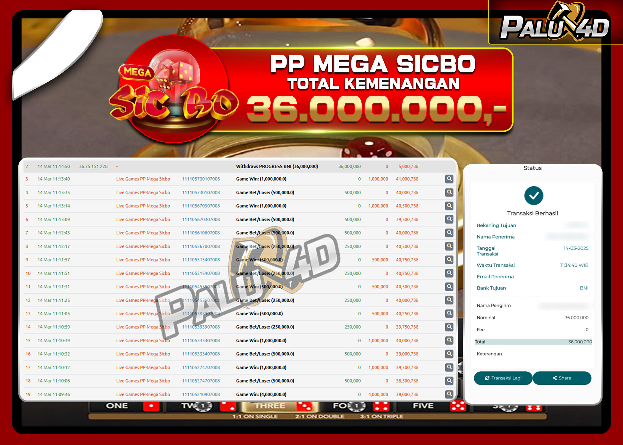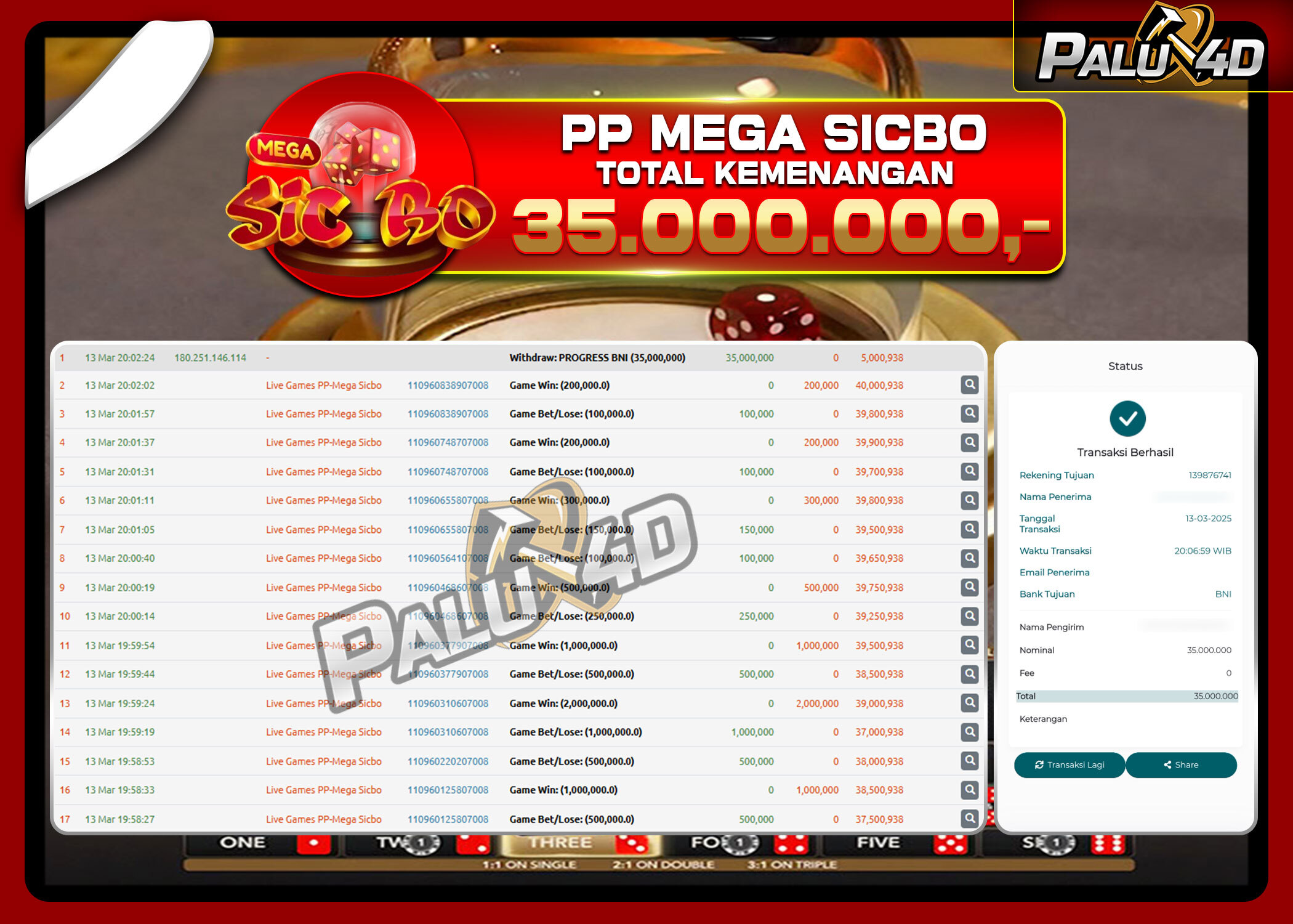 20/03/2025LIVE CASINO PALU4D – Menang Live Games MEGA SICBO Rp 15.000.000.,- LUNAS PALU4D – Menang Live Games MEGA SICBO Rp 15.000.000.,- LUNAS PALU4D – Selamat bagi pemenang yang mendapatkan jackpot hari ini 17 Maret […]