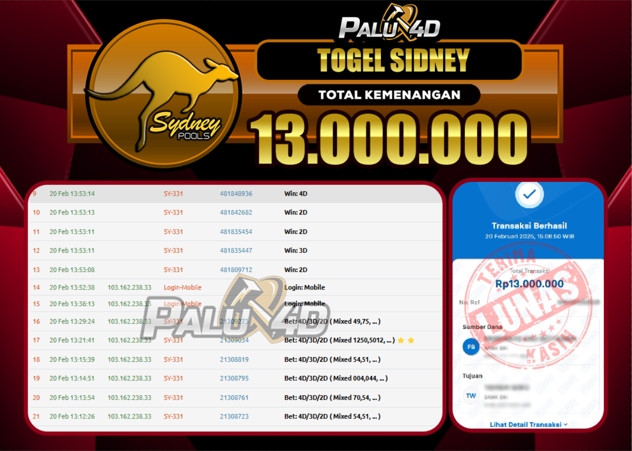 PALU4D – Menang Togel SYDNEYPOOLS Rp.13.000.000.,- LUNAS